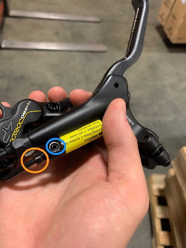 Use a 2mm allen key to remove the set screw (blue circle). Once removed, use a small crescent wrench to loosen off the motor inhibitors (orange circle) by 2-3 turns. If you loosen them off too far, no problem. Simply reinsert and gently tighten them by 1-2 turns. Make sure not to over-tighten them as they will prevent the motor from engaging properly.